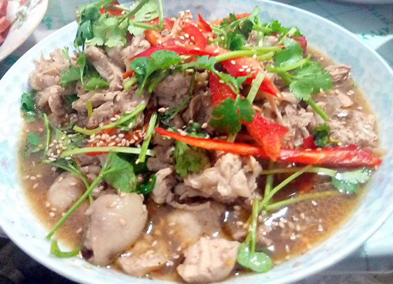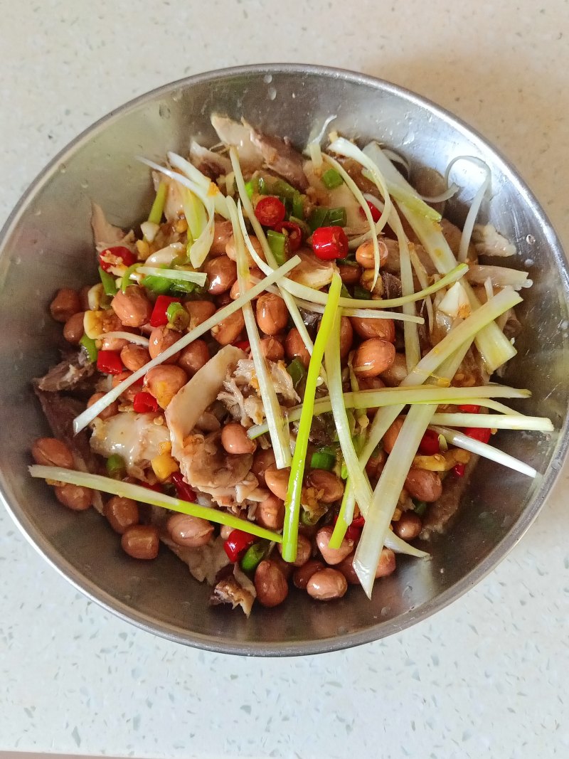 9:倒入油炸花生米和葱丝(我买料香菜没拿回家,非常遗憾没加香菜末)。
