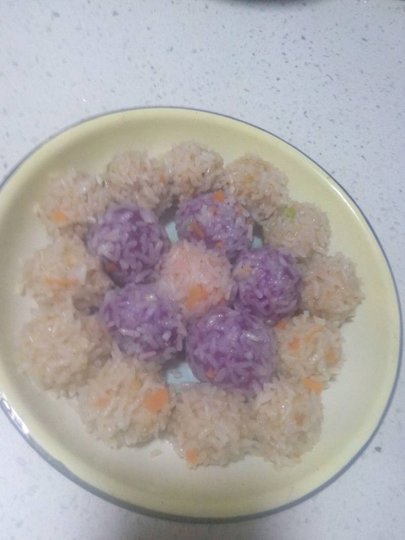 5:蒸熟的紫薯按成泥状,也揉捏成丸子