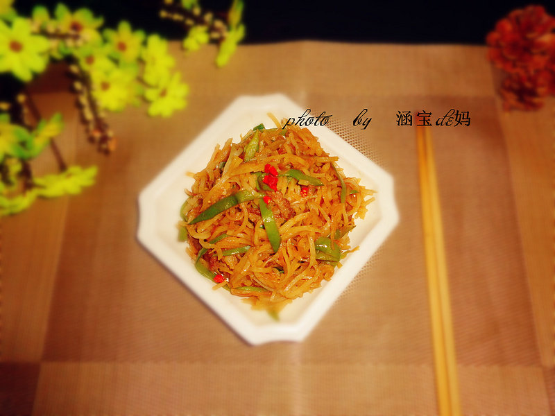 7:水分不多的时候(期间可以打开锅盖看一下)调入盐翻炒均匀,放入青红辣椒丝翻炒均匀,调入半汤匙陈醋鸡精翻炒均匀即可。