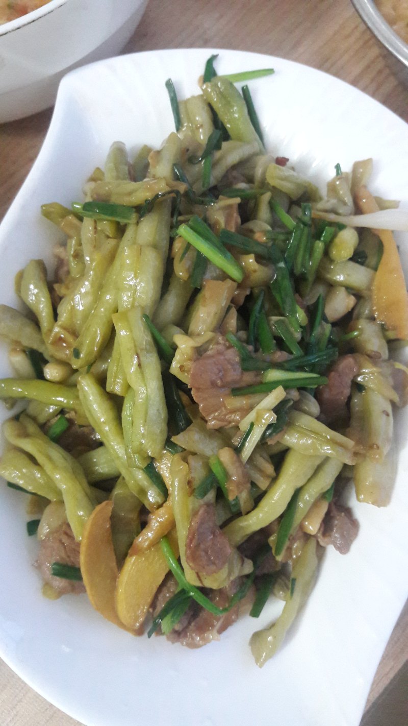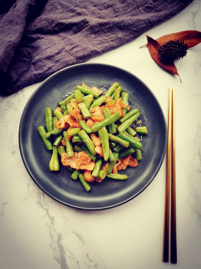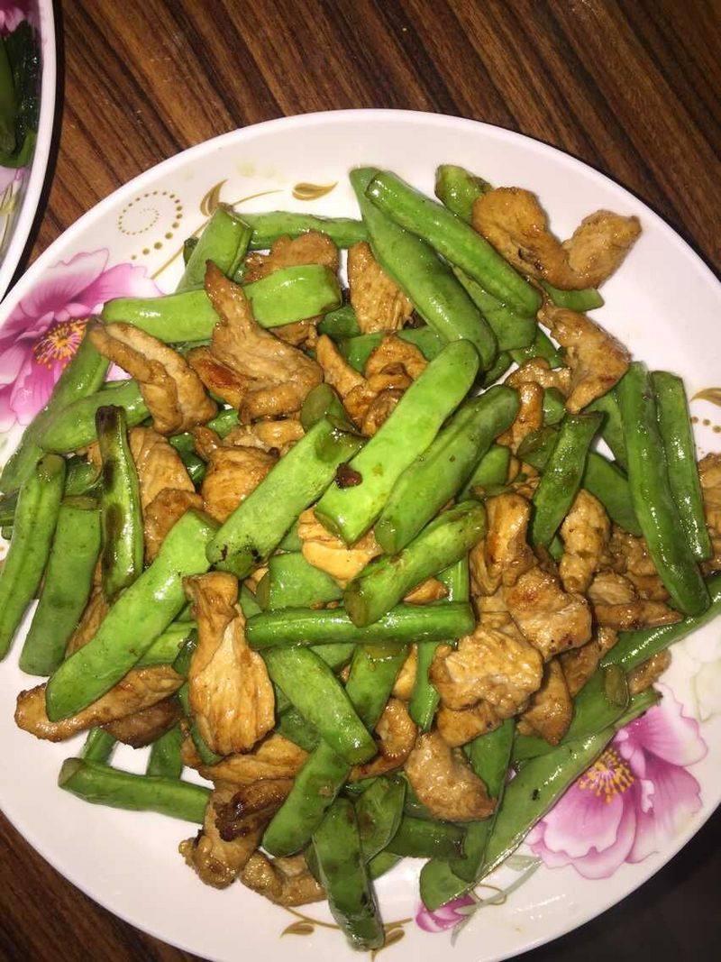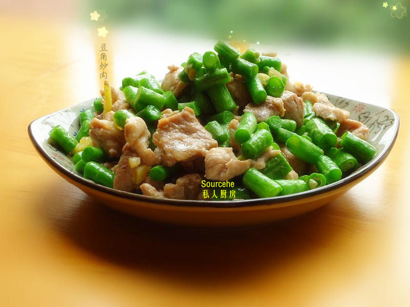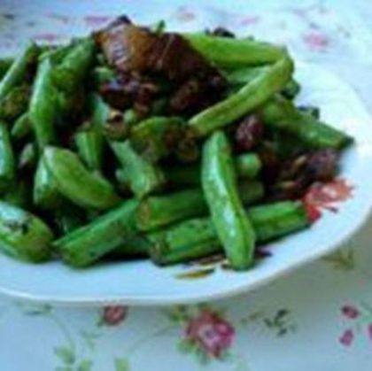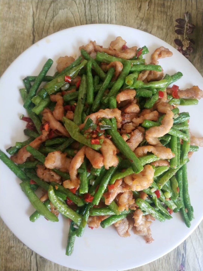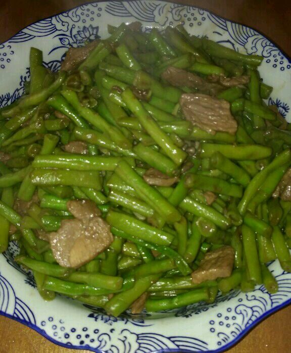 7:瘦肉八九成熟时放入豆角。翻炒。