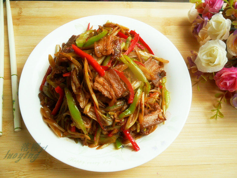 4:放入肉片,开中火,翻炒至肉片出很多油,肥肉的地方看上去略有透明装,调入料酒翻炒。