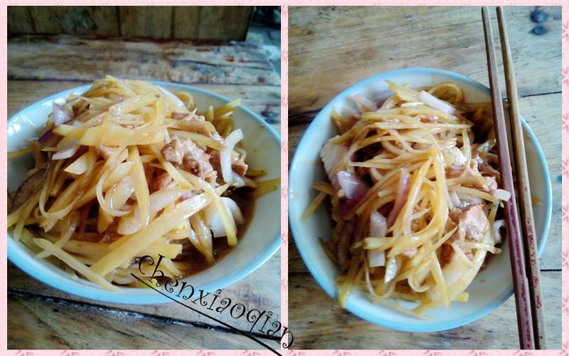 1:第一次上菜有些慌,切完才想起拍照,所以没拍合影。土豆洋葱去皮洗净,切丝,瘦肉切丝