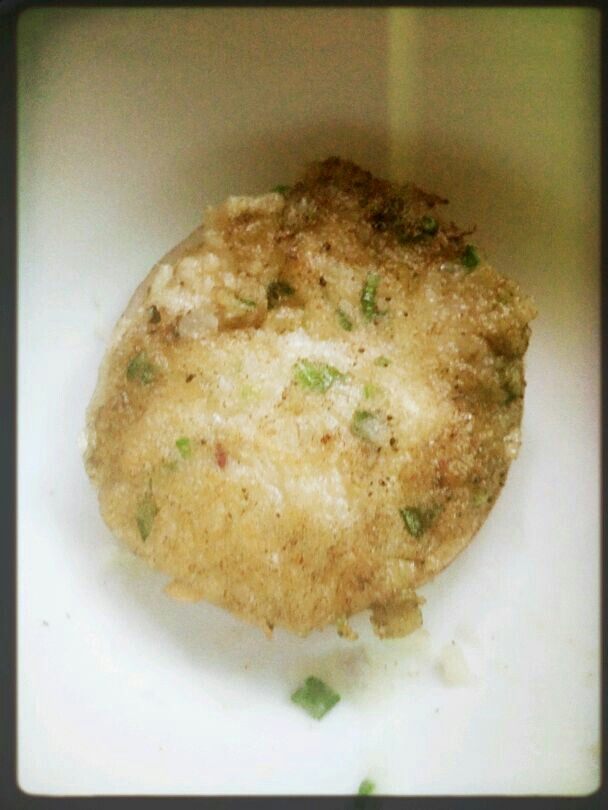 4:第四步,在平底锅里放油,油热之后,放上洋葱圈。然后在洋葱圈内填上馅!煎至两面呈金黄色就ok了!!