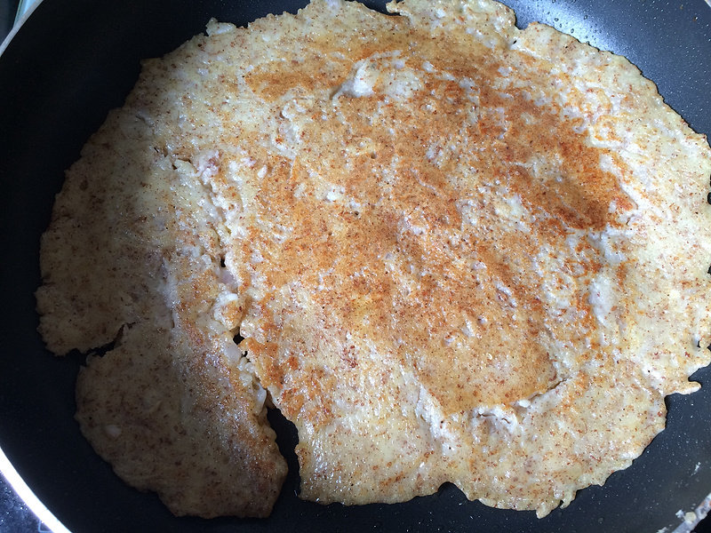 5:筛入面粉,然后搅拌均匀。在中火烧热的平底锅内到少许油,不用太多,火不能太大,宁愿小也不要太大,否则很容易煎黑。中小火慢慢煎。