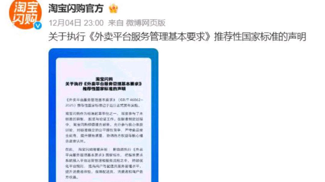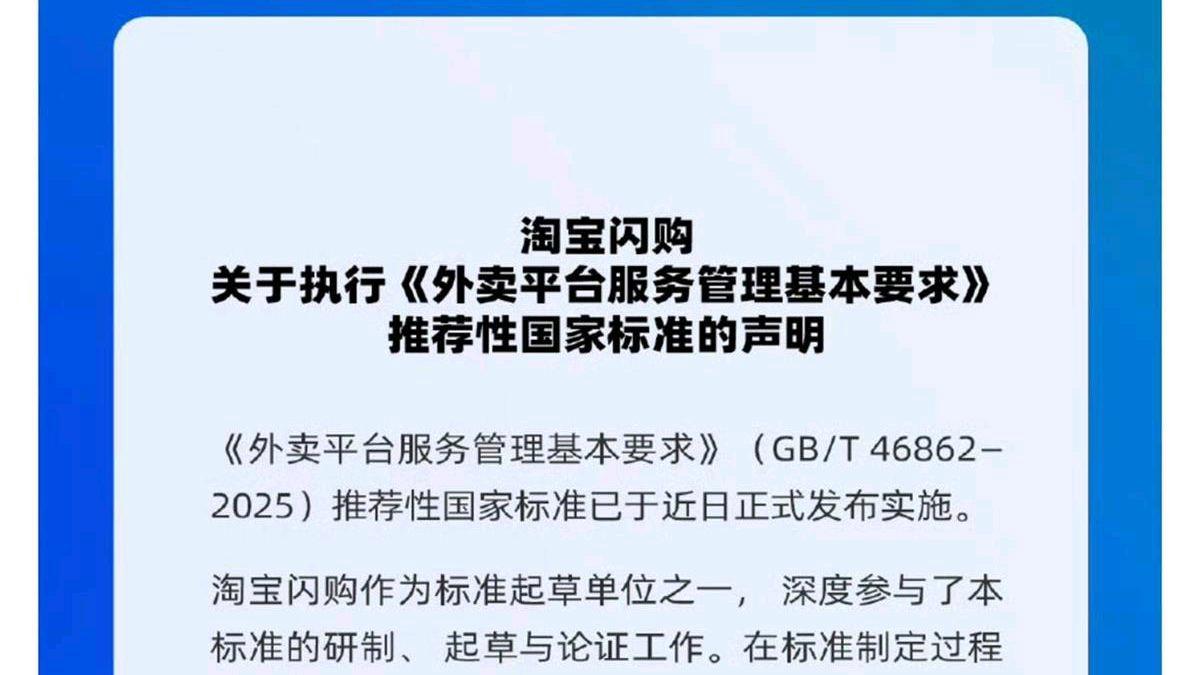 近日,市场监管总局发布实施推荐性国家标准《外卖平台服务管理基本要求》。京东、美团、淘宝闪购发布声明称:将自愿执行《外卖平台服务管理基本要求》国家标准。