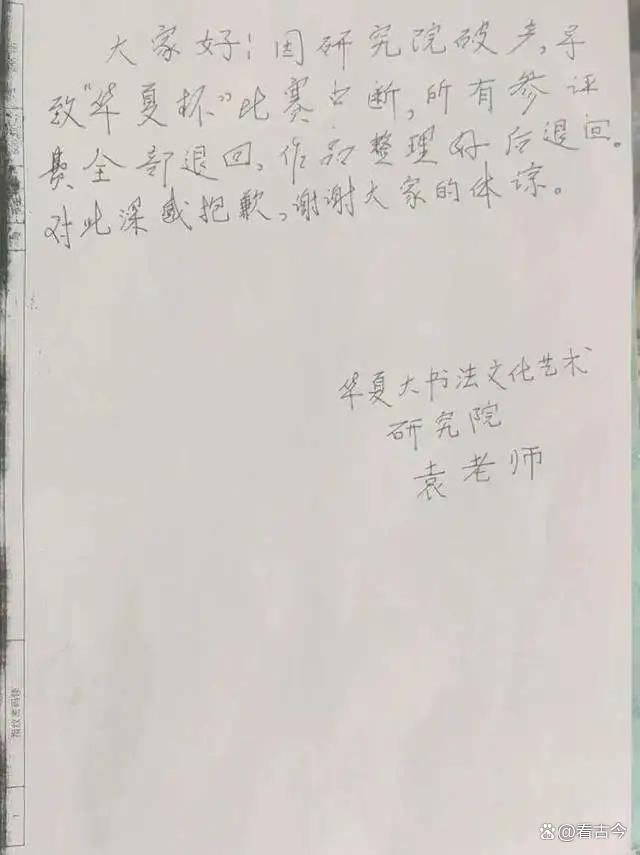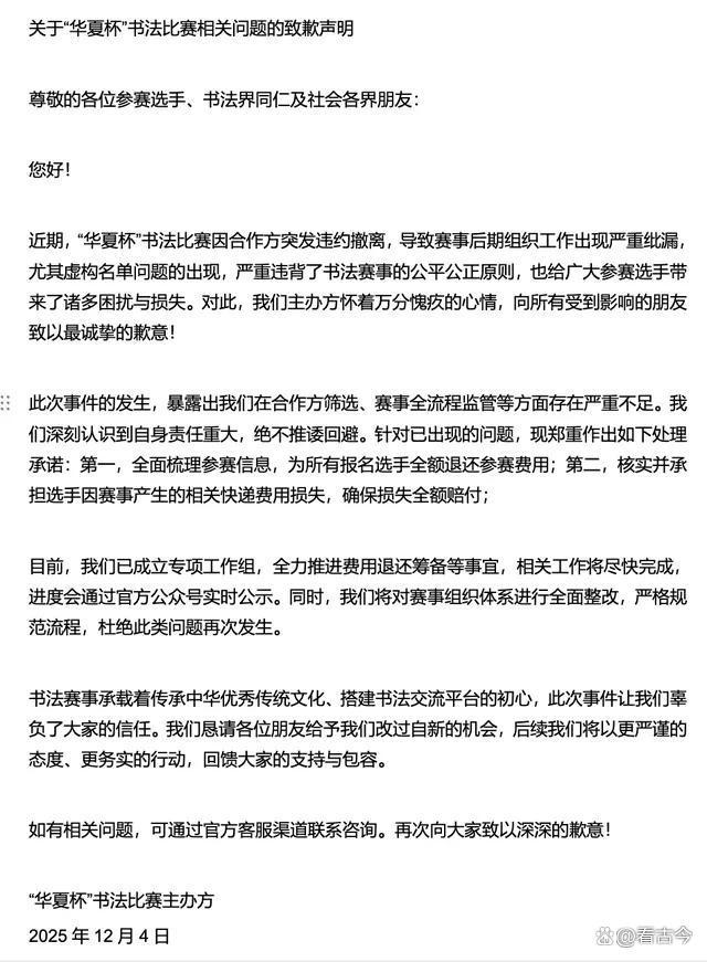 这“华夏杯”书法比赛,背后的故事也是一箩筐。主办方是华夏大书法文化艺术研究院,执行事务合伙人、赛事组委会主任、评审费收款人都是袁伟民。这比赛规则也挺“特别”,每件投稿作品收30元评审费,这收费标准,也不知道是咋定的。结果呢,比赛办着办着就出问题了。2025年12月4日,主办方出来致歉,说研究院破产导致赛事中断,承诺全额退还参赛费,还赔付快递费用损失,退回参赛作品。这波操作,就像一场闹剧,从开始到结束,都充满了戏剧性。