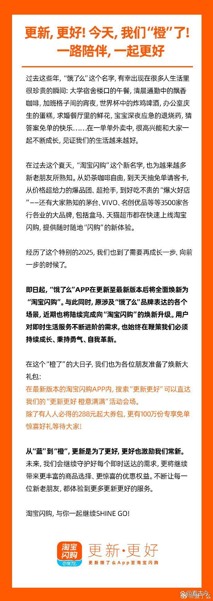 话说这饿了么,那可是外卖界的元老级选手,多年来一直稳稳地占据着咱们手机里的重要位置。不管是加班到深夜饿得前胸贴后背,还是周末宅家懒得做饭,只要打开饿了么,各种美食就像长了腿似的,嗖嗖地就送到家门口。可如今,它却要“改头换面”,摇身一变成为“淘宝闪购”,这波操作,简直让人惊掉下巴!