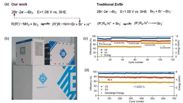 锌溴液流电池是大规模储能领域的重要技术路径之一,凭借成本较低、安全性能好、容量可灵活调节等特点,被视为可再生能源并网的潜在解决方案。但长期以来,其商业化进程受限于充电过程中产生的强腐蚀性溴单质(Br₂)——传统体系中,溴离子(Br⁻)氧化生成的Br₂会形成深红色腐蚀性液体甚至油状溴相,不仅腐蚀电池组件,还会导致电解液分层、反应可逆性下降,循环寿命通常仅约30次,难以满足大规模储能的长期使用需求。